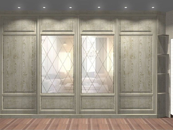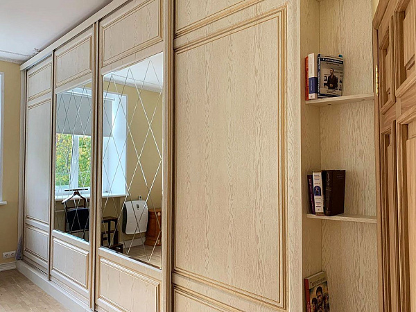 Классический стиль поддерживает бежевый оттенок фасадов — двери-купе выполнены в цвете дуб белый с применением патины. Шкаф с золотой патиной выглядит очень благородно. Патинирующий состав наносится вручную мастерами-художниками, он красиво подчеркивает фактуру дерева и многоуровневый рисунок фрезеровки.