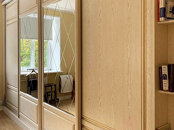 Елена Ж. обратилась к нам за встроенным шкафом. Несколько лет семья пользовалась гардеробной, но захотела заменить её на шкаф-купе в спальню в классическом стиле, подходящий по стилистике интерьеру. Перед нами стояла втройне сложная задача: неудобный тупой угол по одной из стен, кривые плоскости по периметру, 5 метров длины, нуждающиеся в функциональном обустройстве. Главная техническая особенность проекта — угол 110°, который заказчики пожелали задействовать. Чтобы его компенсировать, мы сделали узкие декоративные полки для книг. Благодаря им шкаф плавно «примкнул» к боковой стене, скрыв специфику планировки. Усложнили проект сильные неровности по стенам и полу: чтобы выровнять плоскости, использовали подиум и карниз.