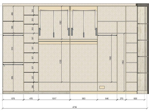 Для наполнения выбрали два ЛДСП: в белом цвете выполнены все горизонтальные элементы, в кремовом — вертикальные детали. В гардеробной Елены хранилось большое количество вещей на вешалках, поэтому в шкафу запланировали много штанг под одежду различной длины. Сделали отдельные секции высотой от 900 мм до 1900 мм. Задействовали подпотолочное пространство — установили пантографы. Для вещей в сложенном виде спроектировали вертикальный ряд полок с расстоянием между ними 30 см — оптимальная высота для комфортного использования.