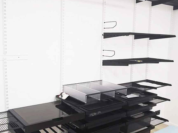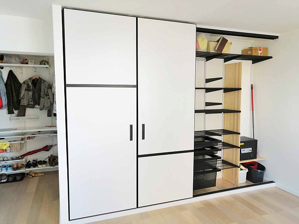 Оригинальные черно-белые двери скрывают особенное содержимое. Внутри шкафа гардеробная система ARISTO в двух цветах! Акцентные черные кронштейны и полки на белых направляющих, практически незаметных на белой стене. В проекте системы хранения всё как обычно удобно и практично: максимум выдвижных элементов, полочка для аксессуаров с тонированным стеклом и специальное отделение для хозяйственных принадлежностей. Кстати, гардеробную систему установили еще до дверей – в нише уже хранили вещи, когда приехали двери.