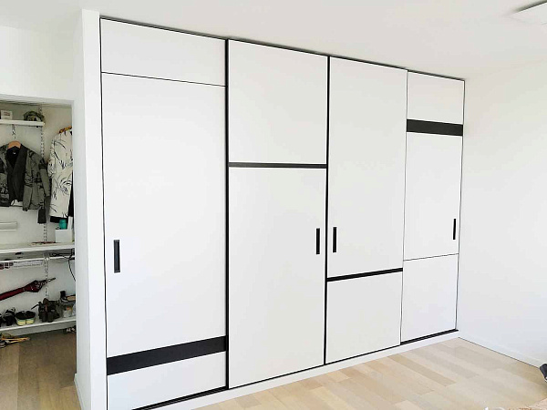 Для конструкции раздвижных дверей была выбрана система NOVA (Нова). Скрытые кронштейны, позволяющие спрятать треки – выгодно отличают эту систему от обычной системы дверей-купе. Никаких направляющих! Вставка ЛДСП Ламарти в цвете Белоснежный напоминает белый лист бумаги, черные матовые линии профиля – выразительные контуры геометрических фигур. Идеальная графика!
