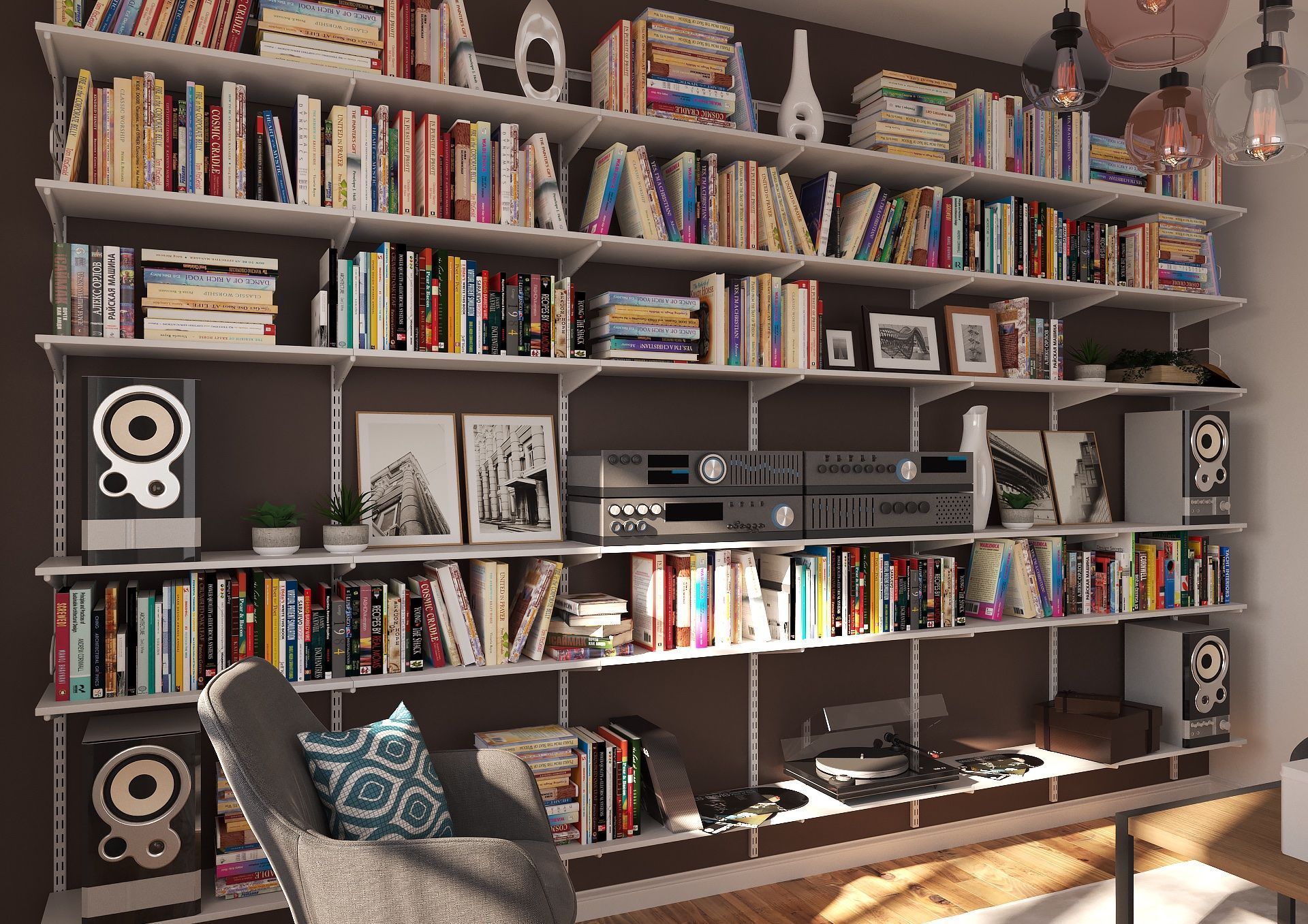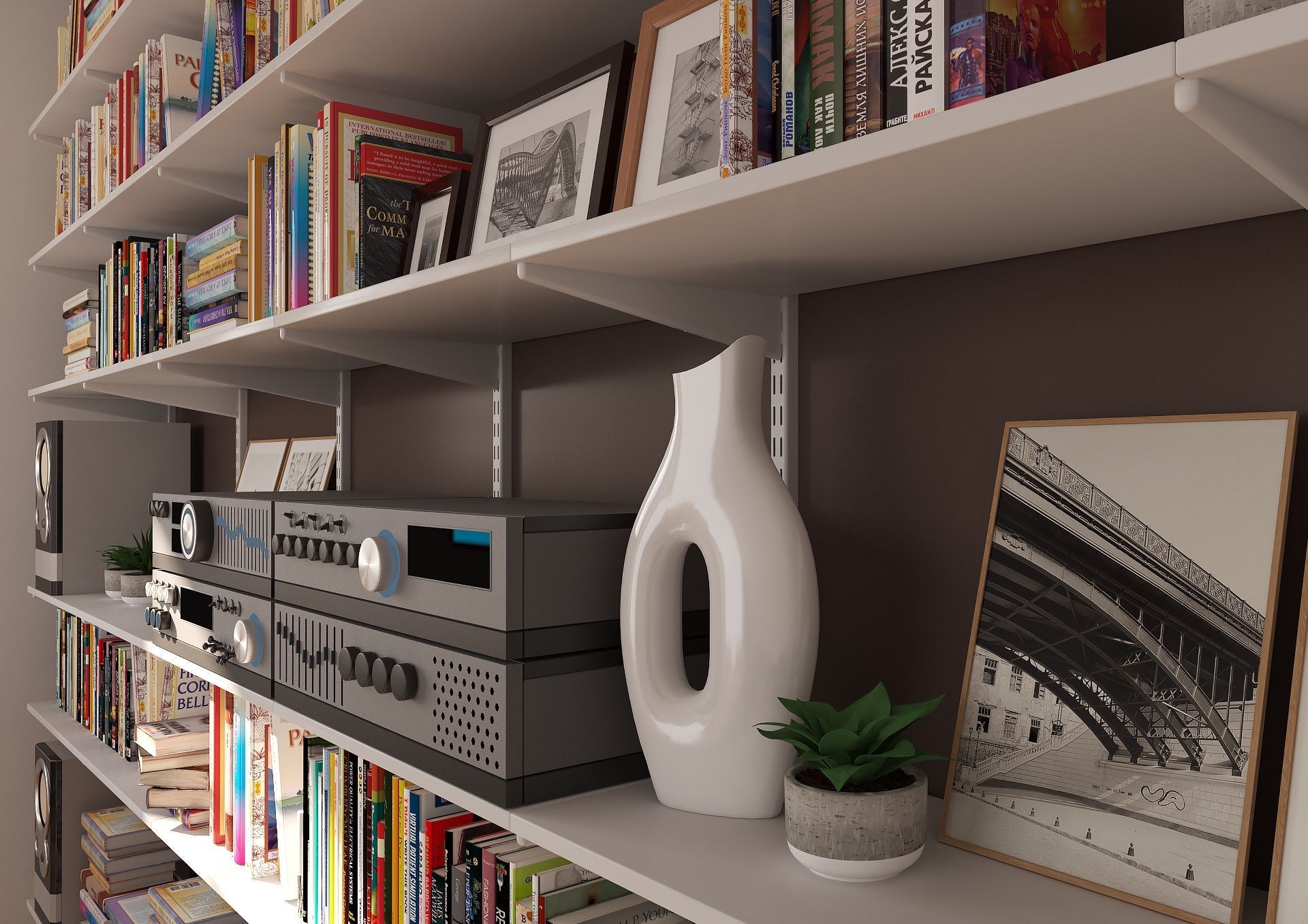 Стеллаж белый с деревянными полками создается на основе Системы хранения ARISTO. Один из главных плюсов такого стеллажа: простота сборки! Навесные полки фиксируются кронштейнами к металлическим направляющим, которые в свою очередь крепятся к стене. Раз, и готова элегантная, вместительная и надежная зона хранения!