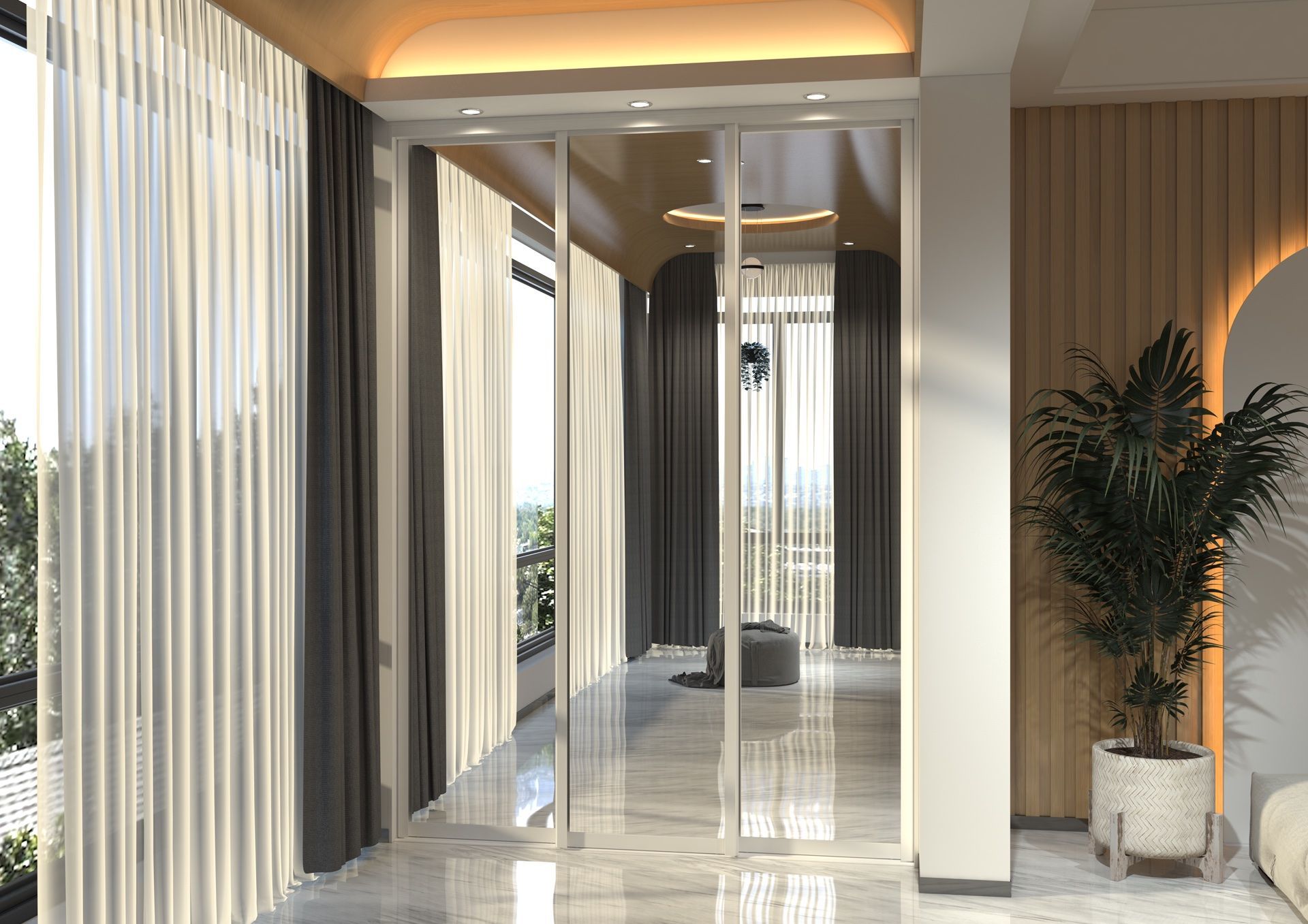 Двери купе с зеркалом, выполненные в профиле цвета «Белый Матовый», добавляют света в интерьере. Профиль для дверей-купе FLAT имеет прямую, широкую видимую часть и очень удобен для захвата. А благодаря матовому белому покрытию идеально сочетается с белой поверхностью ниши и визуально не заметен.